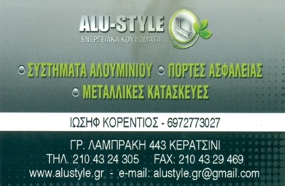 Η εταιρεία «ALU-STYLE» δραστηριοποιείται στο χώρο του αλουμινίου και των σιδηροκατασκευών με απόλυτη επιτυχία. Η εταιρεία μας ασχολείται με κουφώματα αλουμινίου ενεργειακά και μη, πόρτες ασφαλείας, κάγκελα αλουμινίου, κατασκευές σιδήρου παντός τύπου, πτυσσόμενες ασφάλειες, ρολά, σίτες, καθώς και πόρτες εσωτερικές.