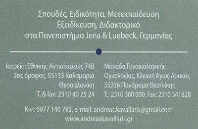 Ο Δρ. Ανδρέας Ν. Καβαλλάρης, με ειδικότητα Γυναικολόγου – Μαιευτήρα και εξειδίκευση στη Γυναικολογική Χειρουργική Ογκολογία και στη Λαπαροσκοπική Χειρουργική, σπούδασε και εξειδικεύτηκε στη Γερμανία και από το 2009 ως το 2011 διετέλεσε υποδιευθυντής της πανεπιστημιακής κλινικής του Lübeck της Γερμανίας.